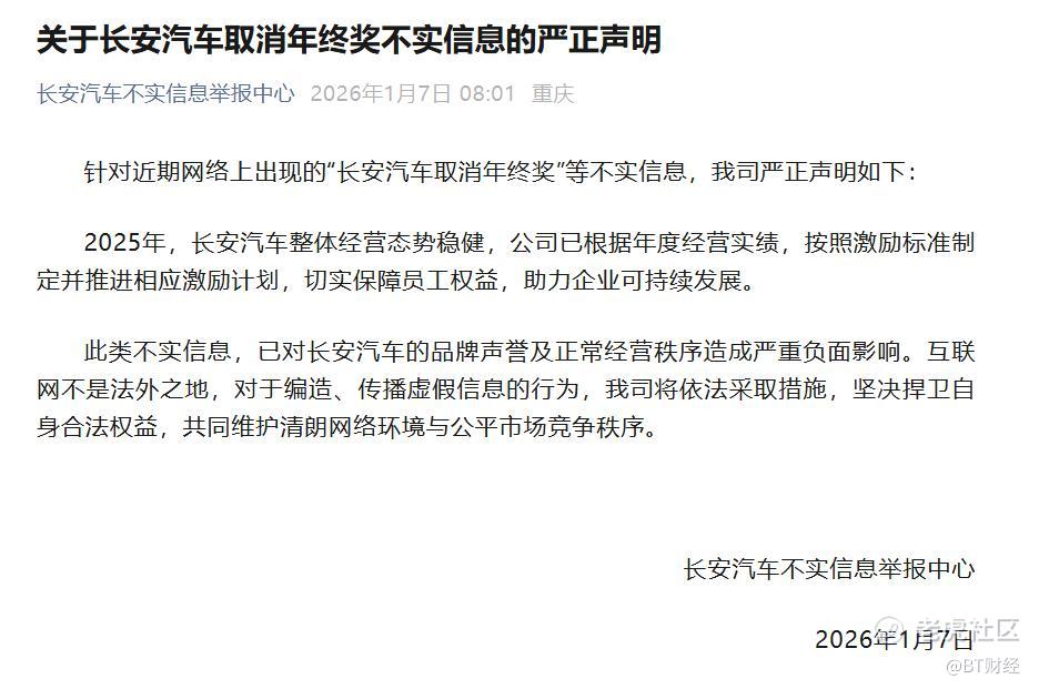 这让不少网友感到错愕,毕竟长安汽车年度销量目标完成率超过97%,在汽车行业中已属不错的表现。随后长安汽车紧急回应称消息不实,2025年长安汽车整体经营态势稳健,公司已根据年度经营实绩,按照激励标准制定并推进相应激励计划。