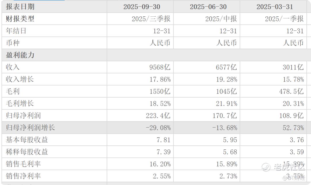 2025年11月13日京东发布三季报,2025年前三季度京东营收9568亿元,同比增长17.86%。归母净利润223.4亿元,同比下滑29.08%。净利润大幅下滑主因外卖等新业务亏损扩大。其中第三季度总营收2991亿元,同比增长14.85%,高于市场预期,其中商品收入约2262亿元,同比增长10.5% 服务收入约729亿元同比增长30.8%,占比达24.4%,创历史新高。 净利润52.76亿元,同比下滑55.03%。
