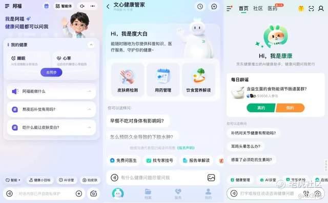 图源 / 蚂蚁集团的“阿福”(左)、百度的“文心健康管家”(中)、京东的“康康”(右)