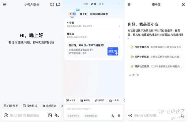 图源 / 字节跳动的“小荷AI医生”(左)、科大讯飞的“晓医”(中)、百川智能的“百小应”(右)