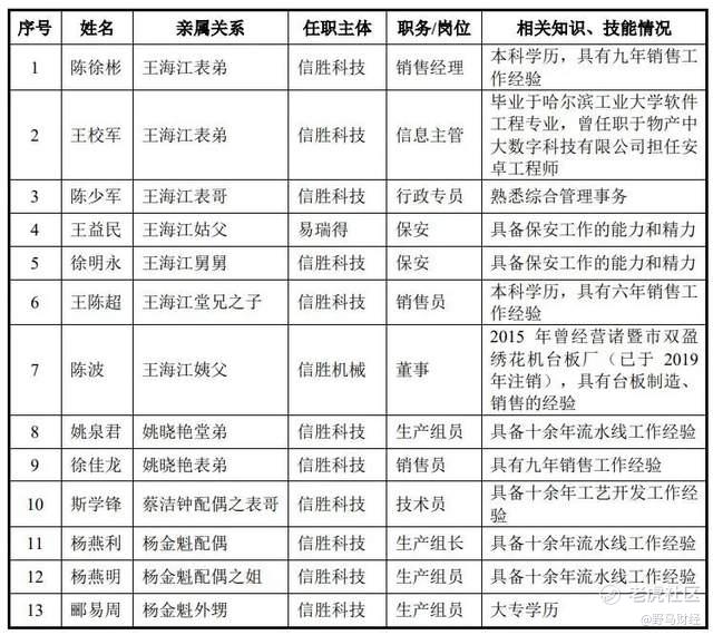 比如王海江的两个表弟和一个表哥分别在信胜科技任销售经理、信息主管和行政专员,姚晓艳的堂弟和表弟分别在信胜科技任生产组员和销售员。此外,信胜科技董事蔡洁钟配偶的表哥在信胜科技任技术员,公司工艺部经理兼生产部经理杨金魁的外甥、配偶以及配偶的姐姐,也分别在信胜科技任生产组员和生产组长。