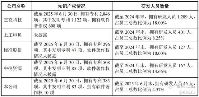 截至2025年上半年末,信胜科技有研发人员46人,仅占员工总数的4.57%,同样低于可比公司8.25%—18%的人员占比。