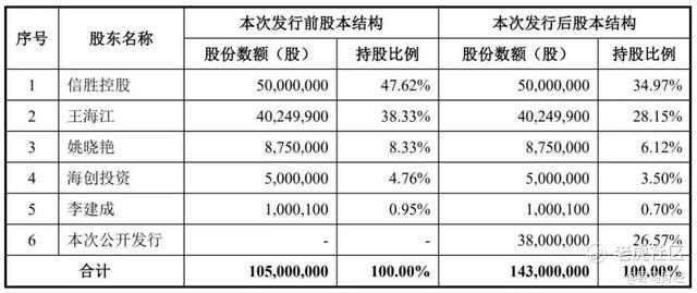 截至目前,王海江和姚晓艳夫妇直接持有信胜科技46.67%的股份,并通过信胜控股和海创投资合计控股52.38%,合计控制99.05%的股份对应的表决权,夫妇二人是共同实控人。