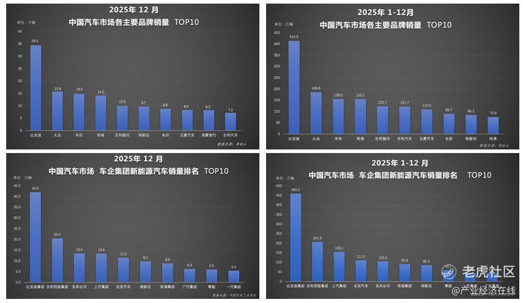 随着2025年圆满收官,中国汽车市场交出年度成绩单。行业数据显示,比亚迪在12月及2025年全年中国汽车市场品牌销量、新能源销量、集团销量等多个核心维度均位列第一。并连续四年蝉联全球新能源车市场销量冠军、中国汽车市场品牌四连冠,以实力问鼎全球市场。