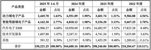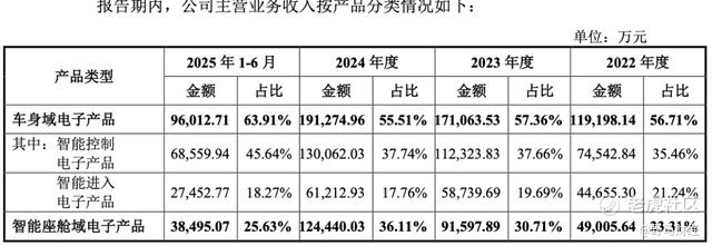 它主要制造四大类“大脑”:车身域电子产品是它的王牌和现金牛,像个 “车辆大总管”,管理车门、车灯、车窗等基础功能。它占据了公司过半的营收,2022年-2024年、2025年1-6月(下称“报告期”),该部分销售金额分别为11.92亿元、17.11亿元、19.13亿元和9.6亿元,营收占比常年超过55%。