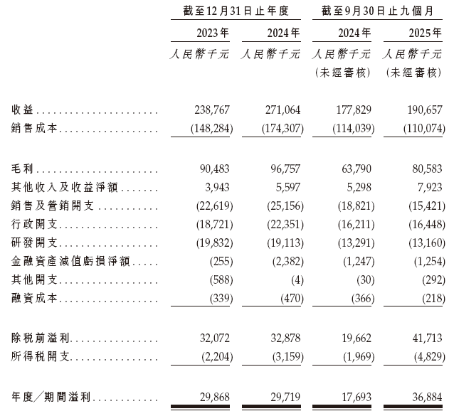 招股书显示,在过去的2023年、2024年和2025年前九个月,万怡医学的营业收入分别为人民币2.39亿、2.71亿和1.91亿元,相应的净利润分别为2,986.8万、2,971.9万和3,688.4万元。