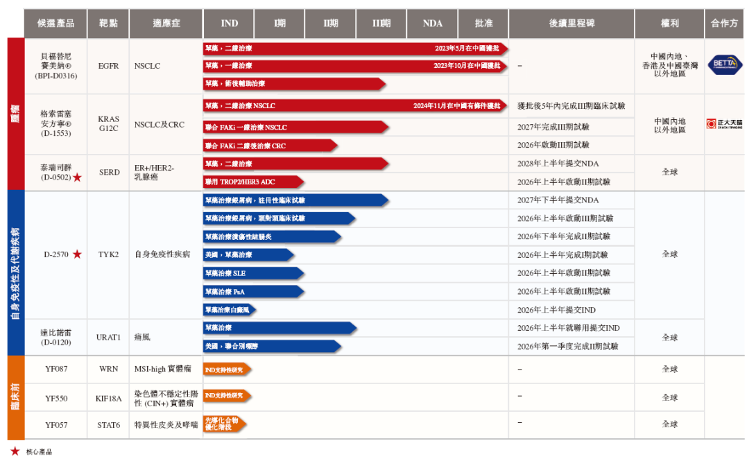 D-2570,一款自主研发的口服高选择性TYK2变构抑制剂,用于治疗银屑病等自身免疫性疾病,已启动注册性III期临床试验;同时,公司也已启动针对溃疡性结肠炎(UC)的中国II期临床研究;