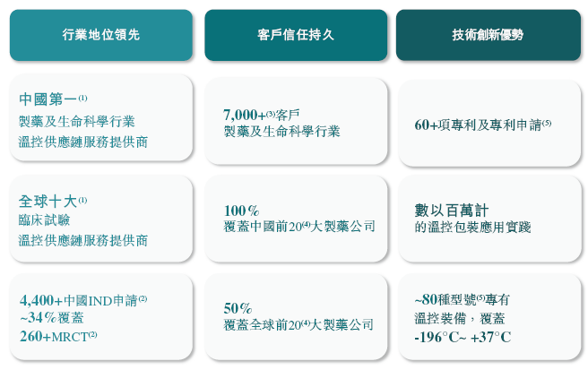 根据弗若斯特沙利文的报告,于2024年按收入计,上海生生是中国市场排名第一的制药及生命科学温控供应链服务提供商,也是全球前十大临床试验温控供应链服务提供商中唯一的中国企业。