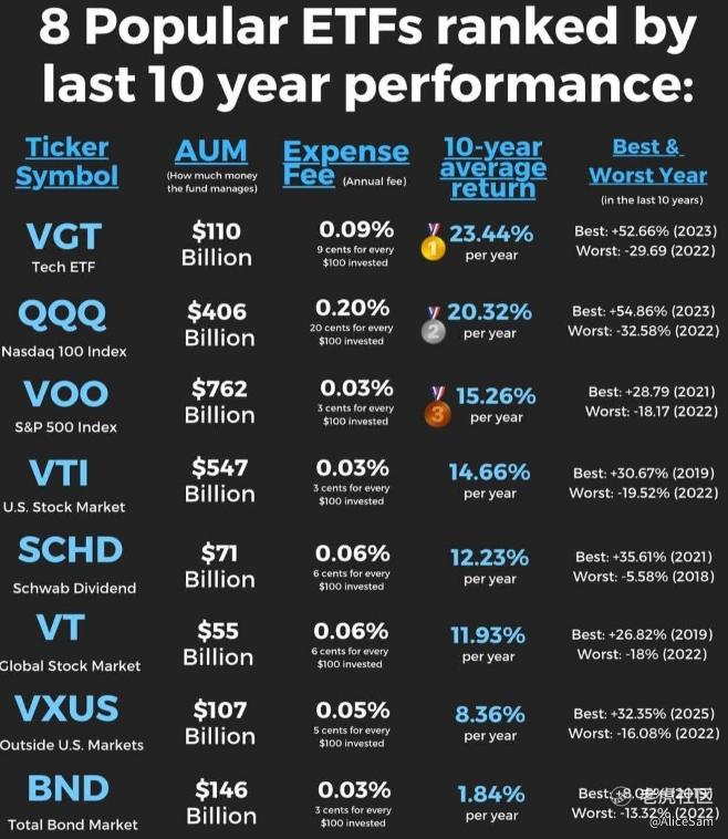 如果你想“躺平”拿市场平均,VOO/VTI+VXUS+BND即可。如果你愿意承受-30%波动换20%+年化,科技双雄VGT/QQQ是核心。如果只为了退休或现金流需求,那么,SCHD的 股息+低回撤 是“睡后收入”利器。