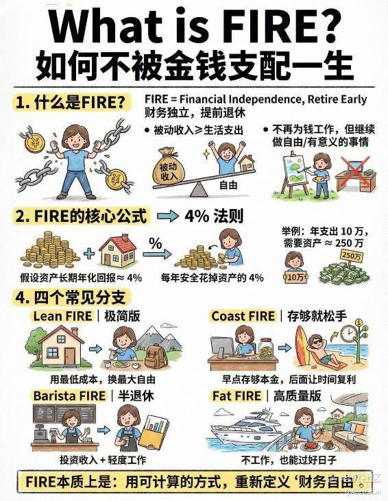 要说到什么是FIRE,FIRE 的核心是让“被动收入 ≥ 生活支出”,从而不用为了生计被迫工作。也就是说不用为钱工作,你愿意工作可以继续,但更多是为了兴趣、使命感或自由,你的人生选择不会再被“必须赚钱”限制,一旦达到这个状态,就拥有 时间自由 + 精神自由 + 地点自由。