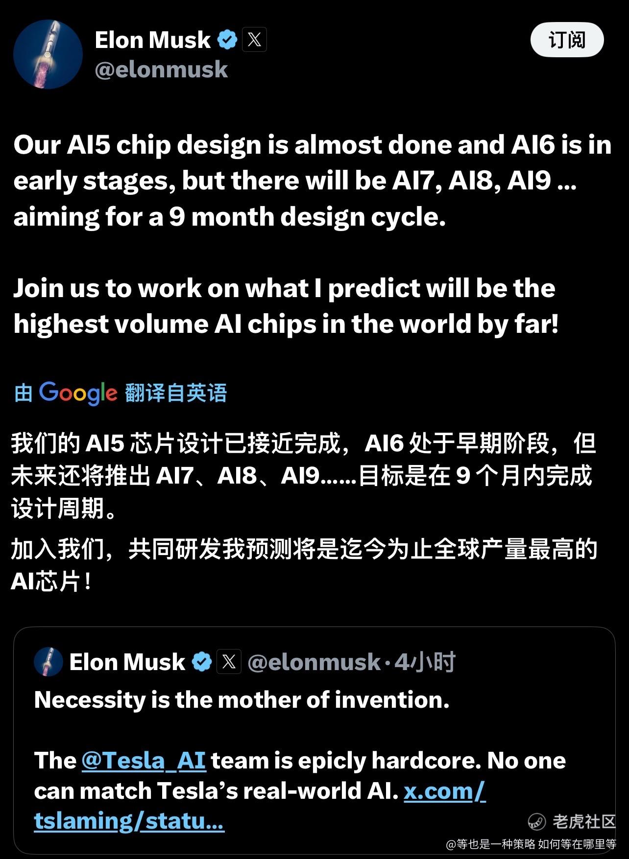 ⚙️🚀 Elon Musk 抛出时间表:AI5 接近完成,AI9 已在路线图上,目标 9 个月一代