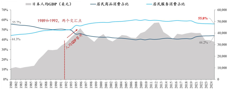美日经验清晰显示,人均GDP 突破 1 万美元是消费结构升级的关键节点,原因是居民消费从“生存”向“发展、享受”转型,服务消费占比自然会快速提升。当人均 GDP 超越 1.5 万美元时,服务消费将正式占据主导地位。