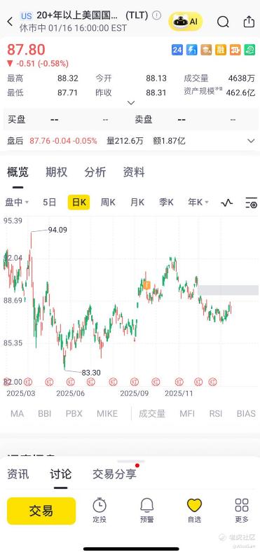 我觉得,市场目前 pricing-in 的好像是“不显著加税、不爆发财政危机”,因此,把全部压力推给了利率上行。因为2026年将是美国债务周期的关键转折点,当这三个支点中任何一个的坍塌,都很可能会重新定义全球资产的定价逻辑。 我觉得$20+年以上美国国债ETF-iShares(TLT)$ 可能在 2026 年见到“大底”,因为2026 年是利率压力最大年份,也是长期利率可能开始“逆转下行”的节点如果利率周期在 2026–2027 反向,期权增强策略可能出现大机会。