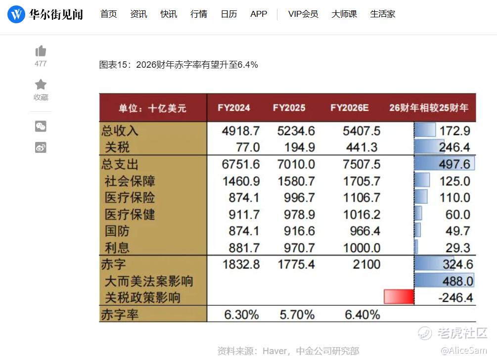 3. 利息维:CBO 基准情景下,2026 财年净利息支出 1.12 万亿美元,首次超过国防 + 退伍军人两项之和,成为联邦预算第一大单项。