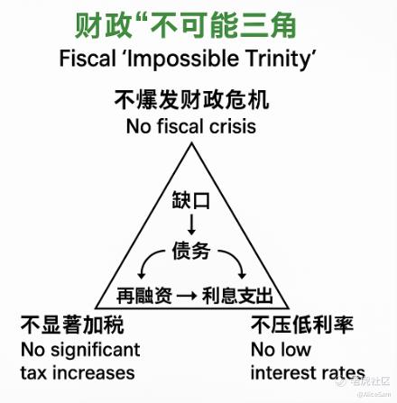 于是,财政“不可能三角”再现了,任何政府同时只能满足这3样里的两项:不爆发财政危机 ,不显著加税,不压低利率 ,也就是说,2026年的美 国 政 府 必须放弃其中一项。
