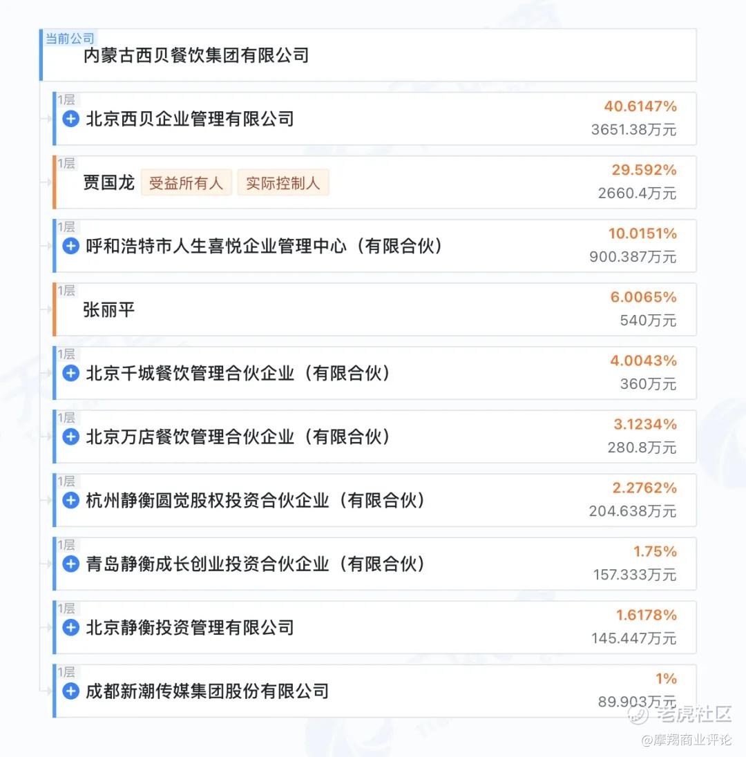 天眼查显示,内蒙古西贝餐饮集团有限公司,也就是可能的未来上市主体,张丽平个人持股6%,贾国龙个人持股29.59%。而作为其母公司的北京西贝企业管理有限公司,贾国龙持股85%,张丽平持股15%。