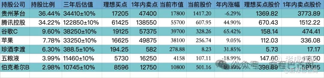 目前十大持仓:贵州茅台36.44%,腾讯34.22%,谷歌9.60%,苹果7.78%,珍酒李渡6.30%,五粮液3.99%,伯克希尔2.98%。目前九大持仓占比88%(其中科技股占比51.6%,白酒股占比46.7%;A股占比40.43%,港股占比40.52%,美股占比20.36%),还有12%观察仓和现金。
