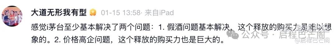 段永平对i茅台上线1499的飞天茅台,和上线9天的销售业绩,有如上评价“感觉i茅台至少基本解决了两个问题:1假酒问题基本解决,这个释放的购买力是难以想象的;2.价格高企的问题,这个释放的购买力也是巨大的。”