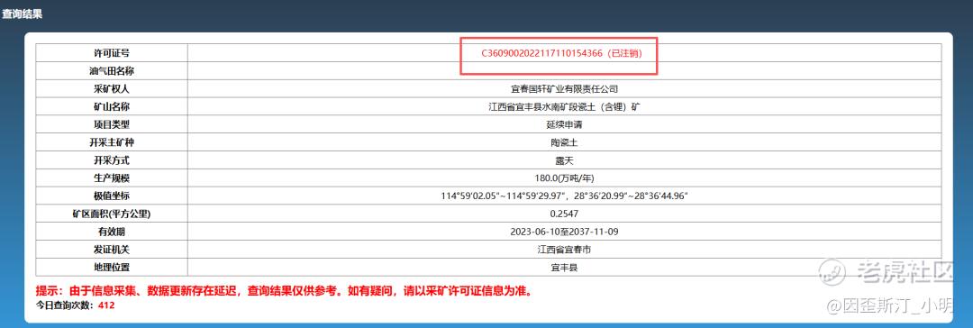 去年底我在写2026年展望的时候刷过一遍采矿证,当时国轩高科水南矿这个瓷土矿没有显示已注销,所以能够锁定注销时间是在2026年1月份也就是最近,与近期的信息相吻合。