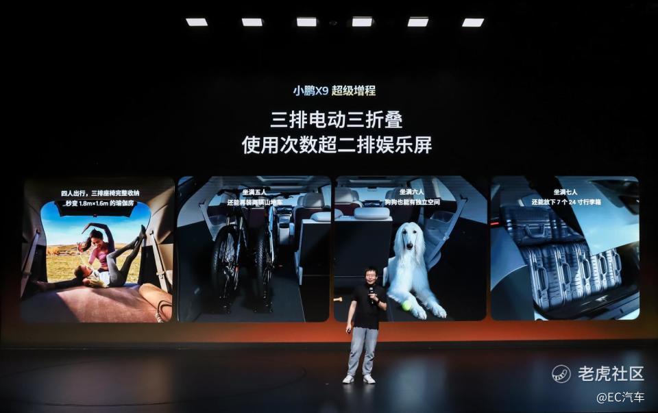 空间灵活性同样领先行业,小鹏 X9 超级增程满足用户丰富出行场景需求。全球首发的三排电动三折叠功能,随时化身可一键切换的“移动LOFT”。该车支持三排4/6分独立收纳,可无缝切换7座满员、6座带宠物、5座载自行车、4座露营大床房等多元模式,真正实现一车搞定通勤、带娃、社交、远行多种出行场景。