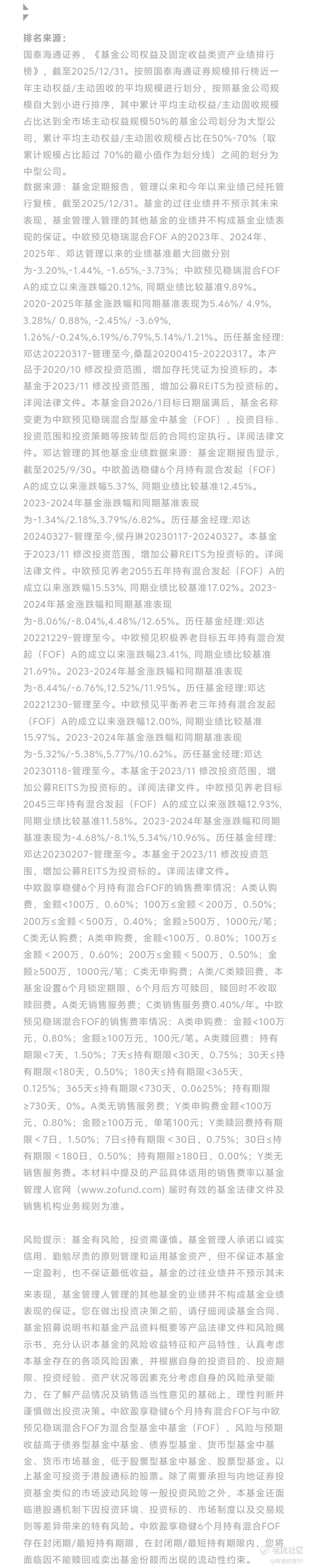 国泰海通证券数据显示,中欧基金在13家权益类大型公司绝对收益业绩榜中,近10年排名TOP1(1/13);在14家固收类中型公司绝对收益业绩榜中,近7年排名TOP3(3/14)——股债双优的实力,也是中欧FOF投资坚实的基础。(排名来源:国泰海通证券,《基金公司权益及固定收益类资产业绩排行榜》,截至2025/12/31,详见文末排名来源。)