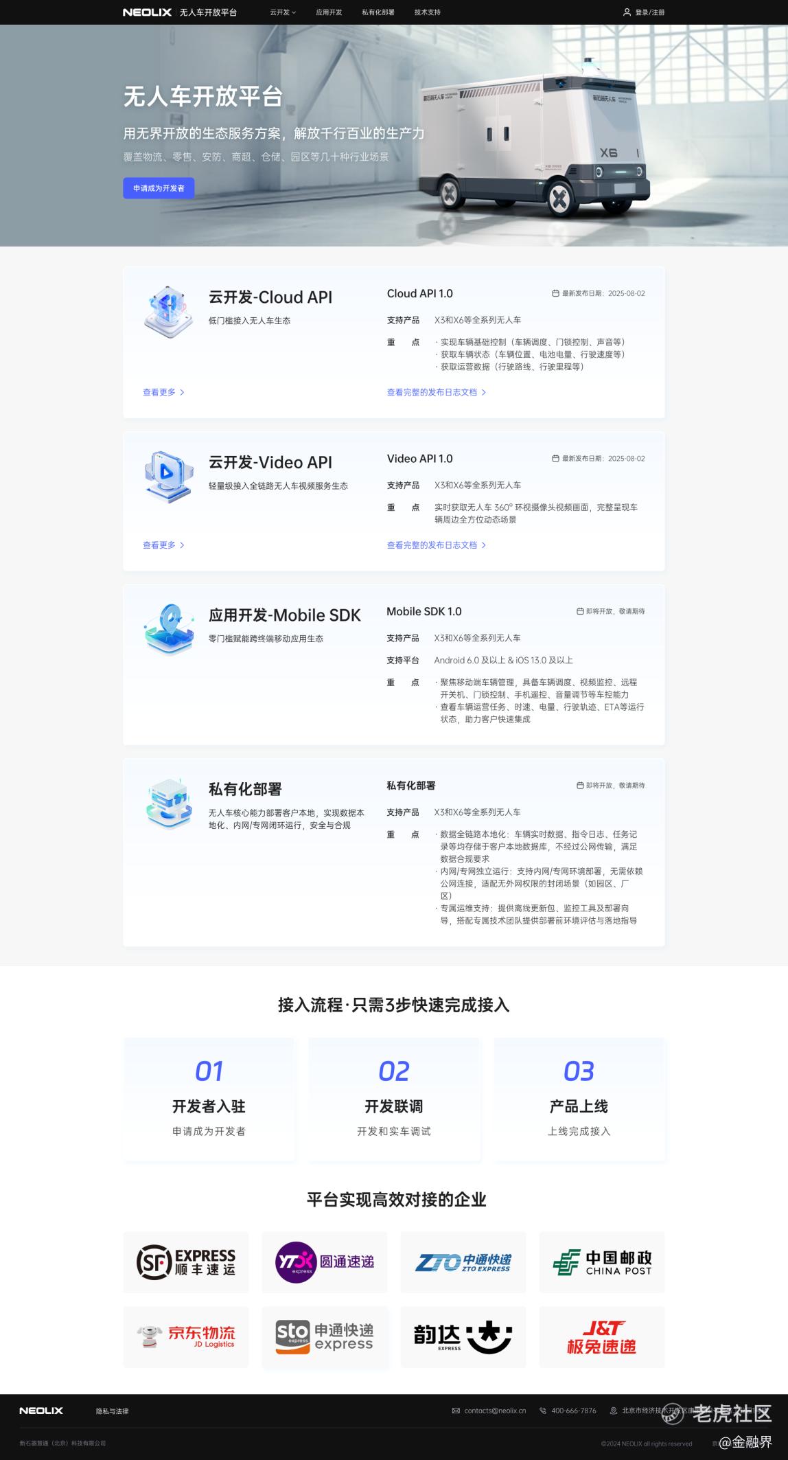 大会现场,新石器正式发布Neolix开放平台1.0。该平台面向物流、零售、安防、商超、仓储、园区等数十类行业场景,为生态合作伙伴提供统一的软件系统接口,支持车辆调度、运营状态与数据的本地化部署,并实现移动端零门槛应用开发,帮助合作伙伴快速完成系统集成与业务落地。