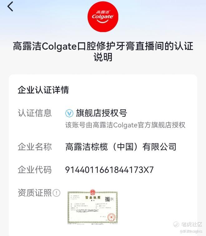 (图源:高露洁Colgate口腔修护牙膏直播间账号的认证截图)