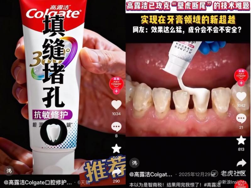 据界面新闻报道,高露洁的“360°抗敏修复牙膏”在短视频平台投放一系列内容,暗示“能让牙缝自己长回来”。