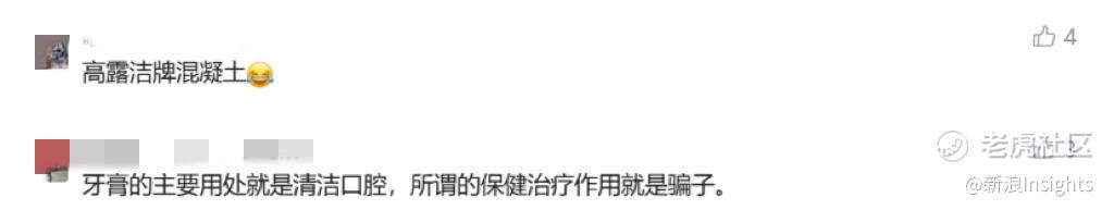 消息传出后引发了广泛关注,并一度登上微博热搜。在评论区,有网友玩梗调侃“高露洁牌混凝土”,戏谑其功效宣传离谱;也有网友称牙膏所谓的“保健治疗作用就是骗子”,质疑品牌夸大宣传收割智商税。