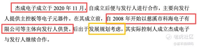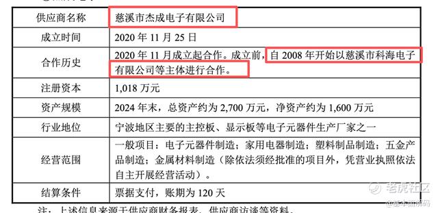 杰成电子:披露称成立于 2020 年 11 月,自成立后立即与惠康科技合作。其业务承接自【慈溪市科海电子有限公司】(该主体于 2008 年开始供货,后注销)。惠康科技解释为“出于发展规划考虑”。