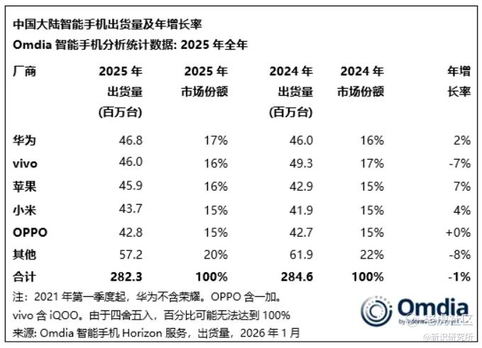 有趣的是,这一变化背后最直接的动因是市场防御与份额争夺。据Omdia最新发布的研究报告显示,2025年中国大陆智能手机市场全年出货量达2.823亿台,同比小幅下滑1%。