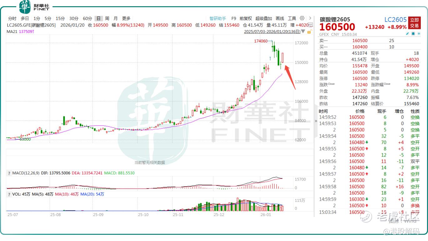 1月20日,碳酸锂期货单日再度飙升8.99%,强势涨停,成交量较前一个交易日也出现明显放大,如下图所示。
