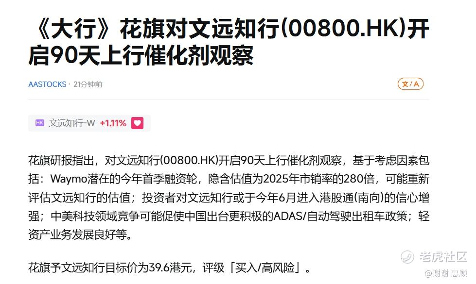 {"i18n":{"language":"zh_CN"},"data":{"magic":2,"id":523826372100704,"tweetId":"523826372100704","gmtCreate":1768913895295,"gmtModify":1768913898031,"author":{"id":3585111811261960,"idStr":"3585111811261960","authorId":3585111811261960,"authorIdStr":"3585111811261960","name":"哈哈2233","avatar":"https://static.tigerbbs.com/91c845af2d9ae68ad5457e1a7dc37191","vip":1,"userType":1,"introduction":"","boolIsFan":false,"boolIsHead":false,"crmLevel":1,"crmLevelSwitch":0,"individualDisplayBadges":[],"fanSize":6,"starInvestorFlag":false},"themes":[],"images":[{"img":"https://static.tigerbbs.com/fdced431ce7bee672ab878477383e5c7","width":"979","height":"585"}],"coverImages":[{"img":"https://static.tigerbbs.com/fdced431ce7bee672ab878477383e5c7","width":"979","height":"585"}],"title":"","html":"<html><head></head><body><p><a href=\"https://laohu8.com/S/00800\">$文远知行-W(00800)$ </a> 花旗给出了39.6港元的目标价位</p><img src=\"https://static.tigerbbs.com/fdced431ce7bee672ab878477383e5c7\" tg-width=\"979\" tg-height=\"585\"></body></html>","htmlText":"<html><head></head><body><p><a href=\"https://laohu8.com/S/00800\">$文远知行-W(00800)$ </a> 花旗给出了39.6港元的目标价位</p><img src=\"https://static.tigerbbs.com/fdced431ce7bee672ab878477383e5c7\" tg-width=\"979\" tg-height=\"585\"></body></html>","text":"$文远知行-W(00800)$ 花旗给出了39.6港元的目标价位","highlighted":1,"essential":1,"paper":1,"likeSize":1,"commentSize":0,"repostSize":0,"favoriteSize":0,"link":"https://laohu8.com/post/523826372100704","repostId":0,"isVote":1,"tweetType":1,"viewCount":173,"commentLimit":10,"likeStatus":false,"favoriteStatus":false,"reportStatus":false,"symbols":["00800","WRD"],"verified":2,"subType":0,"readableState":1,"langContent":"CN","currentLanguage":"CN","warmUpFlag":false,"orderFlag":false,"shareable":true,"causeOfNotShareable":"","featuresForAnalytics":[],"commentAndTweetFlag":false,"andRepostAutoSelectedFlag":false,"upFlag":false,"length":47,"optionInvolvedFlag":false,"xxTargetLangEnum":"ZH_CN"},"commentList":[],"hasMoreComment":false,"orderType":2}