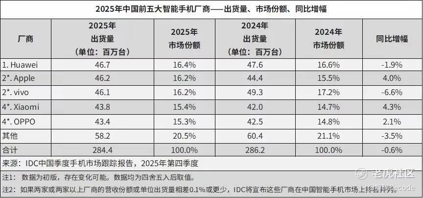 巨变发生在2025年Q4,**凭借Mate80系列的热销实现18.7%的同比增长,而荣耀则是其中唯一同比下滑超10%的厂商。