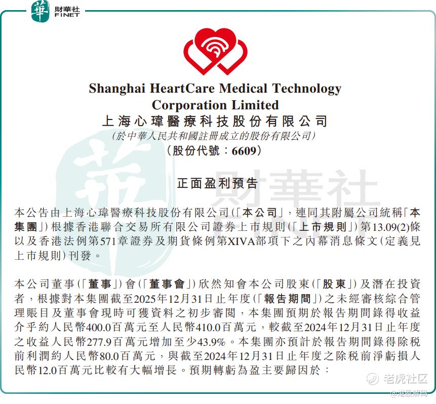 1月20日,心玮医疗发布正面盈利公告,预计2025年实现收益约4亿元至4.1亿元(单位人民币,下同),同比增加至少43.9%;除税前利润约8000万元,而2024年亏损1200万元,扭亏为盈。