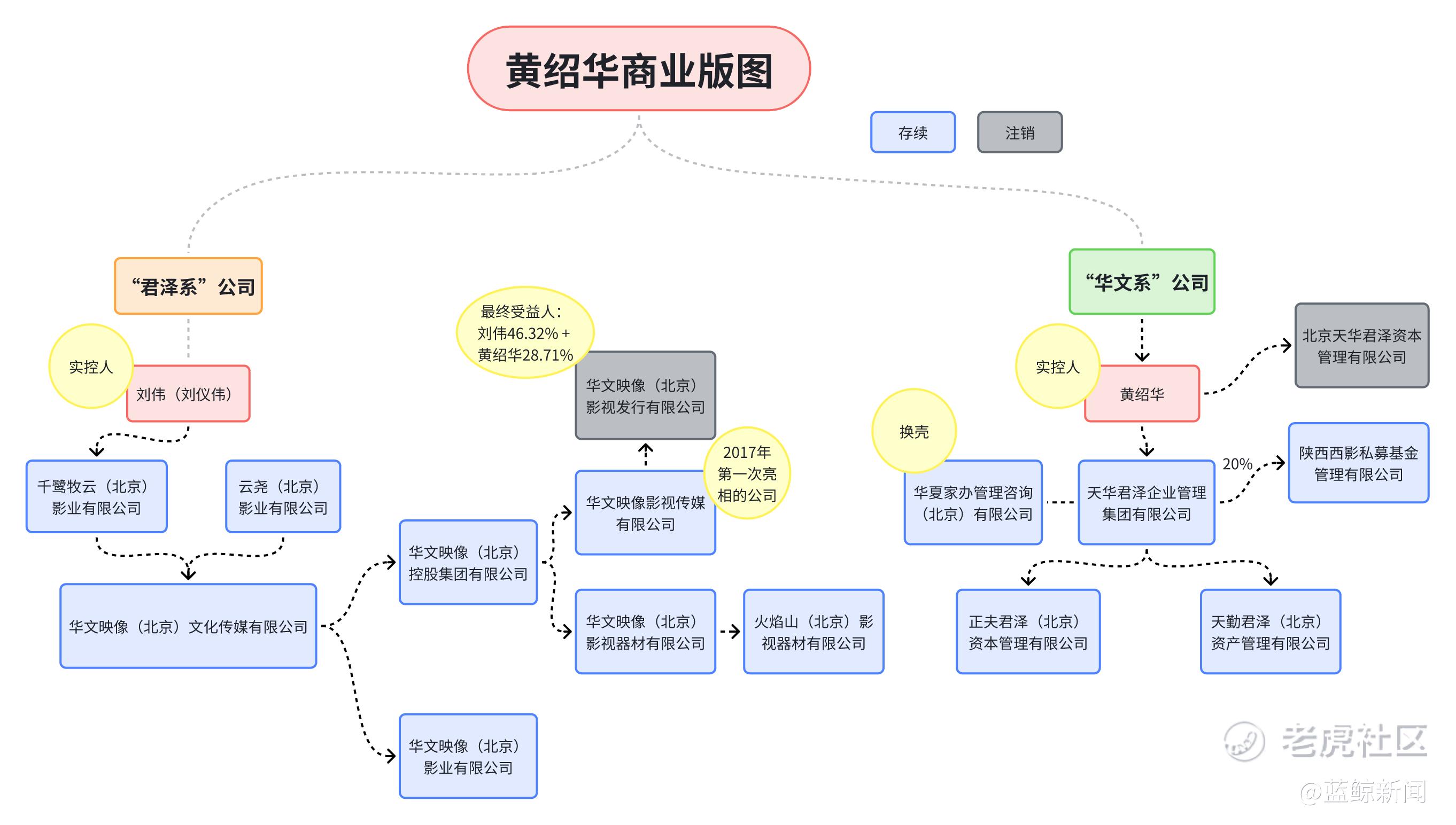 表面看,环伺在投资者周围的主要是天华君泽、华文映像等两家公司,但这只是冰山一角,透过查询工商信息、采访投资者以及前员工,蓝鲸科技记者发现,这些公司背后有两个关键人物,一个是天华君泽的实控人黄绍华,一个是业内知名大咖刘仪伟。
