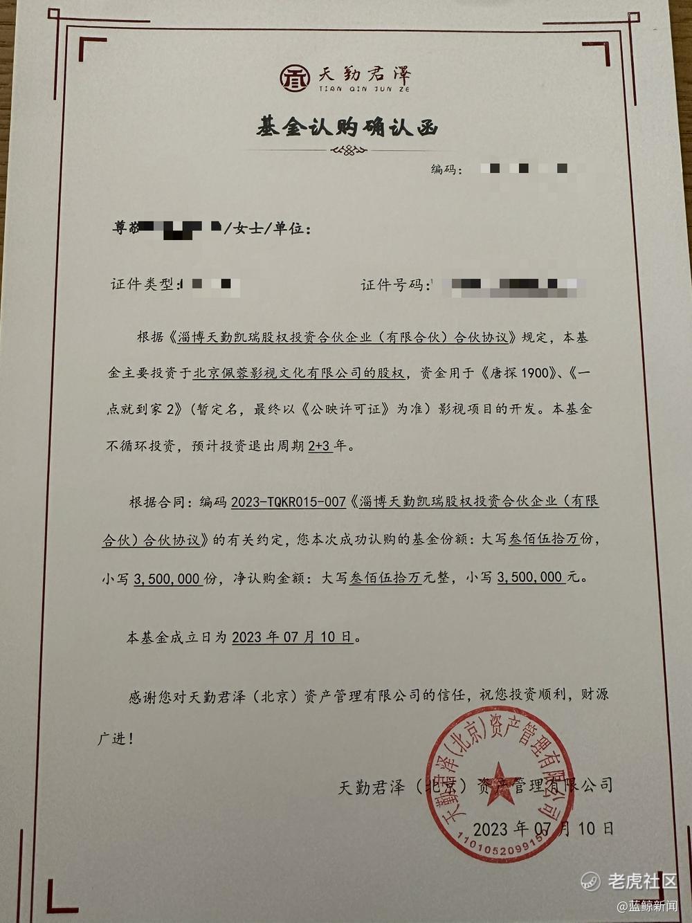 天勤君泽基金认购确认函。(受访者供图)