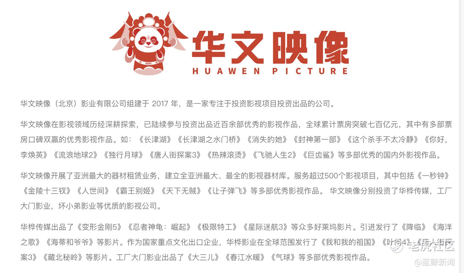 众矢之的华文映像诞生于2017年,那一年电影票房回暖,《战狼2》以56.94亿票房屡屡创纪录,给市场、观众带来中国电影的信心,资本也仍旧火热。在这种背景下,华文映像开始出现在大众视野,随后几年间连续参投头部电影而写下了风光的成绩单。