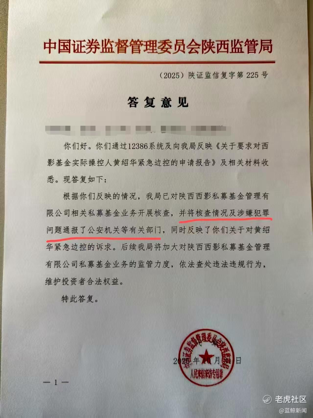 证监会陕西监管局于 2025 年 10 月 31 日出具答复意见,答复意见中称,该局已对陕西西影私募基金管理有限公司相关私募基金业务开展核查,并将核查情况及涉嫌犯罪问题通报了公安机关等有关部门,同时反映了关于对黄绍华紧急边控的诉求。