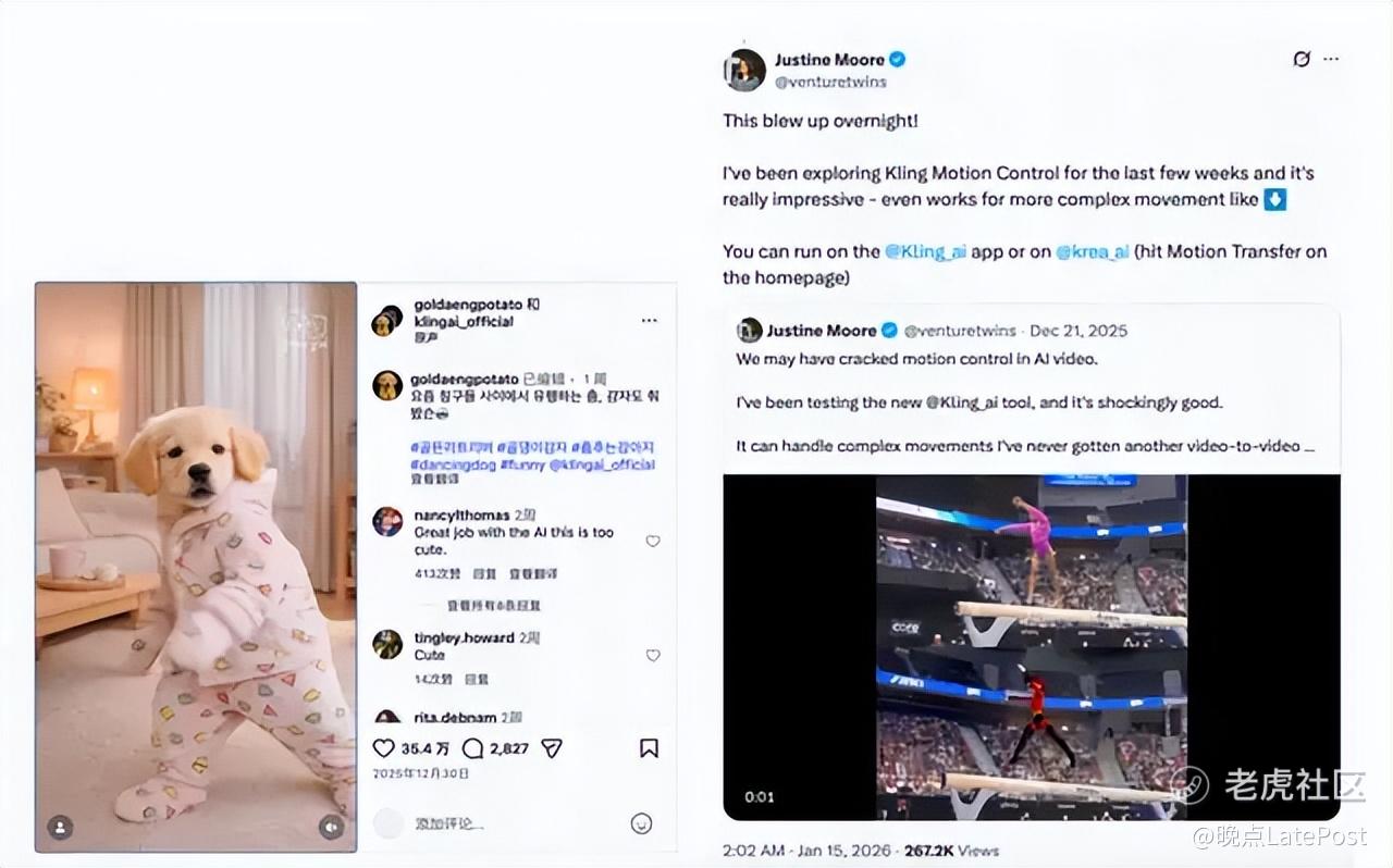 左- 用可灵创作的 “宠物跳舞” AI 视频在全球社交媒体引发讨论;右- 硅谷风险投资机构 a16z 合伙人 Justine Moore 评价可灵。