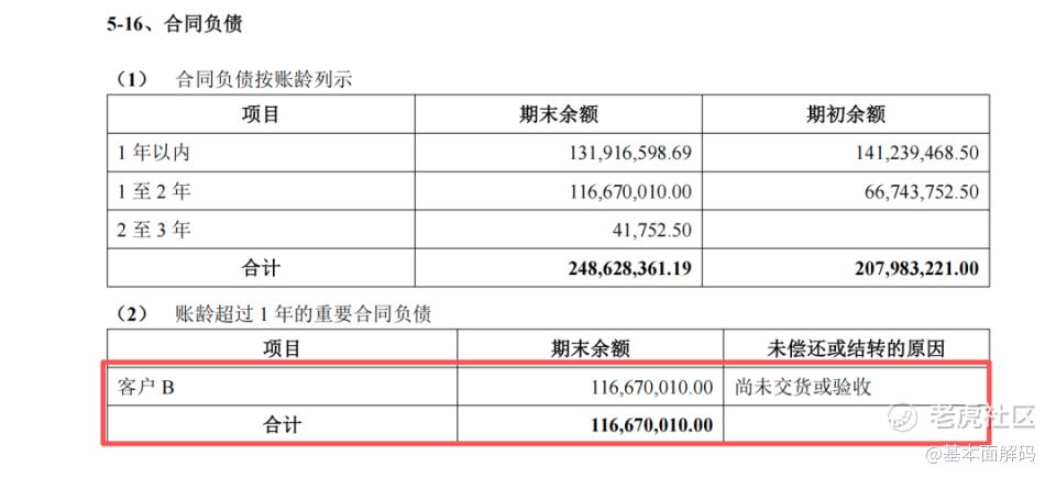 在标的公司的资产负债表中,最引人注目的莫过于高达2.49亿元的合同负债,其中对单一客户(客户B)的预收账款就达到了1.17亿元,且账龄长达1-2年。