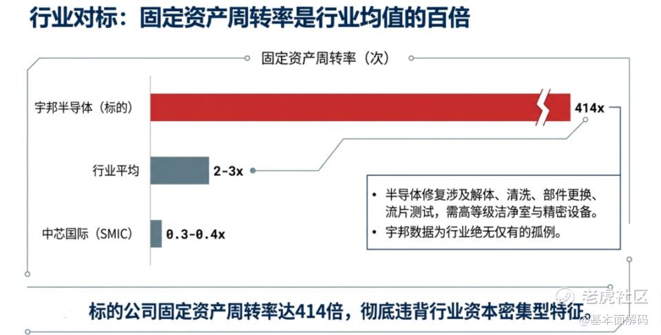 若据此计算,标的公司的固定资产周转率达到了惊人的414倍(2.2亿元 / 53.5万元)。这一数据在半导体行业中是绝无仅有的孤例。通过对比同行业可比公司及行业平均水平,我们可以更清晰地看到这种异常的程度: