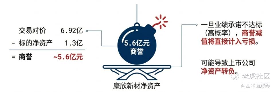 本次交易预计将产生约5.6亿元的商誉(6.92亿对价 - 1.3亿净资产)。对于康欣新材而言,这是一颗巨大的定时炸弹。一旦标的公司业绩未达标(考虑到400%的增长要求,概率极高),上市公司将面临巨额的商誉减值计提。