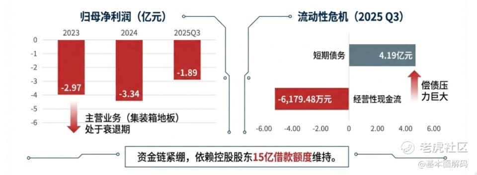 在剖析本次交易的背景时,必须首先审视上市公司自身的财务健康状况,这是理解本次高溢价跨界并购动机的基石。根据公司披露的定期报告,康欣新材的主营业务集装箱地板及木质复合材料正处于行业的衰退期。2023年至2025年三季度,公司归母净利润分别为-2.97亿元、-3.34亿元和-1.89亿元,呈现出不可逆转的亏损扩大趋势。更为严峻的是,截至2025年9月30日,公司有息负债总额已攀升至15.98亿元,而账面短期借款及一年内到期的非流动负债合计4.19亿元,与同期仅为-6,179.48万元的经营性现金流量净额形成了尖锐的偿债剪刀差。