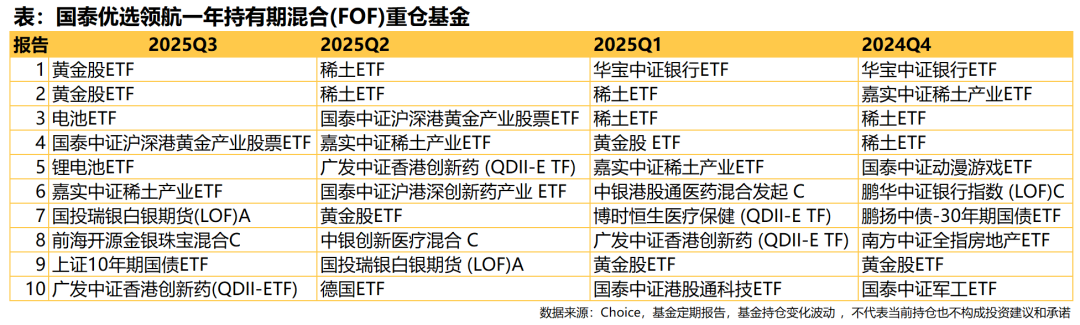 从基金的持仓中还可以发现,国泰优选领航一年持有大量使用ETF作为核心配置工具。2025年三季度前十大重仓基金中,就有8只ETF和一只白银LOF。