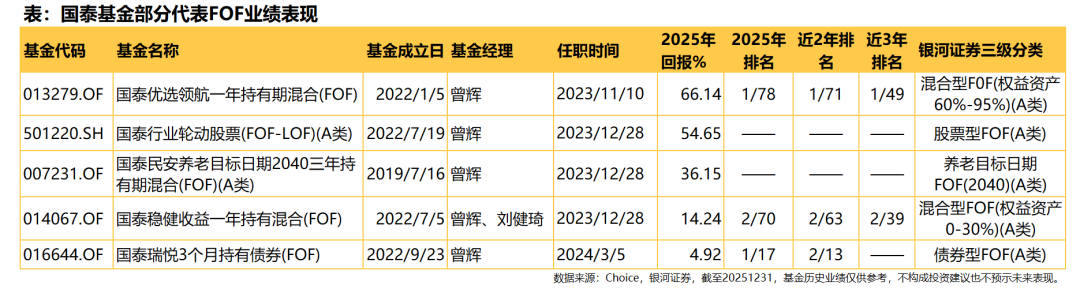 国泰优选领航一年持有期混合型基金中基金(FOF)(成立日期2022/01/05,业绩比较基准为60%*沪深300指数收益率*+30%*中证综合债指数收益率+10%*恒生中国企业指数收益率(估值汇率调整),曾辉自2023/11/10管理至今,2022年至2025年上半年末业绩/业绩比较基准为):-14.27%/ -12.84%, -15.70%/ -6.62%, 3.27%/ 14.67%,11.11%/2.22%;国泰行业轮动一年封闭运作股票(FOF-LOF)A(成立日期2022/07/19,业绩比较基准为80%*沪深300指数收益率+20%*中证综合债指数收益率,曾辉自2023/12/28管理至今,2022年至2025年上半年末业绩/业绩比较基准为):-1.81%/ -7.61%, -13.59%/ -8.22%, -2.73%/ 13.70%, 6.91%/ 0.35%。国泰瑞悦3个月持有期债券型基金中基金(FOF)(成立日期2022/09/23,业绩比较基准为95%*中债综合全价(总值)指数收益率+5%*银行人民币一年期定期存款利率(税后),曾辉自2024/03/05管理至今,成立至2025年上半年末业绩/业绩比较基准为):0.12%/ -0.83%, 3.05%/ 2.04%, 4.21%/ 4.80%, 2.14%/-0.09%;
