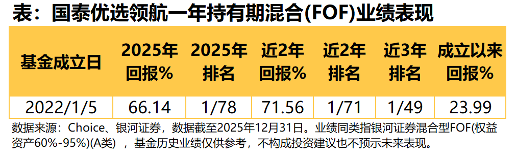 在强调稳健的中波混合型FOF中(权益资产不高于30%),国泰稳健收益一年持有(014067)同样表现突出,2025年年度回报达到14.24%,在同类产品中排名第二,并且,近2年、近3年也是前二的优等生。(数据来源:银河证券,截至2025年12月31日,业绩同类指银河证券混合型FOF(权益资产0-30%)(A类),基金历史业绩仅供参考,不构成投资建议也不预示未来表现。)