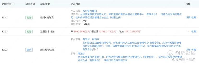 据平台显示,1月20日,内蒙古西贝餐饮集团有限公司发生工商信息变更,新增台州新荣泰投资有限公司、呼和浩特市集体共创企业管理中心(有限合伙)、杭州舟轩股权投资管理合伙企业(有限合伙)、周澔宇、成都迅达光电有限公司为股东,持股比例分别为4.4209%、4.4209%、2.2104%、0.4421%、0.0884%。