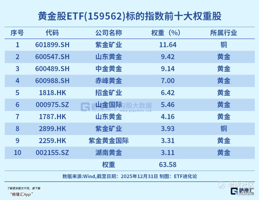 素有“金价放大器”之称的黄金股ETF(159562)在2025年净流入22.26亿元,2026年以来12个交易日继续吸金8.84亿元,规模增至44.94亿元。该基金主要投资于港股与A股市场的黄金产业链公司,权重股集中于金矿企业,如紫金矿业、山东黄金、中金黄金等,同时也覆盖老铺黄金、周大福等珠宝零售公司,场外联接基金为A类021074/C类021075。