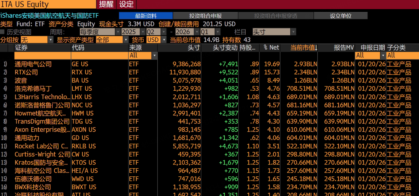 相比直接买军工股,我推荐相关ETF,个股风险大,ETF看准大势就行,目前,规模最大的军工ETF是 $iShares Dow Jones U.S. Aerospace(ITA)$ ,超149亿美元,管理费率0.38%,算低的,不过,它的持仓很集中,第一大持仓股是 $GE航空航天(GE)$ ,占净值的比例高达19.7%;第二大持仓股是 $雷神技术公司(RTX)$ ,占净值的15.7%: